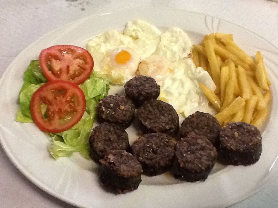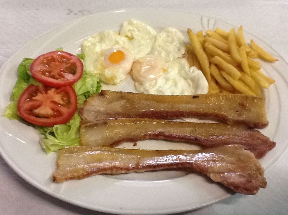 Panceta, morcilla o lacón con huevos fritos, patatas, lechuga, y tomate.